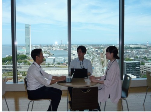 新潟西港、朱鷺メッセを見渡せるロビーで軽くミーティング!会議室空いてなくて良かったね!!