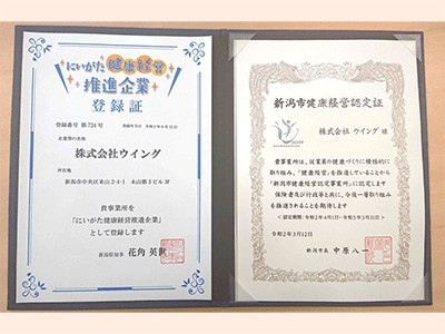 ウイングは残業の削減と有給休暇の取得促進を中心的とした取り組みを、継続的に進めています。加えて、健康診断受診率100%を達成している点や、全社員対象に年1回ストレスチェックの実施などを評価いただき、新潟市健康経営認定制度において、シルバークラスに認定されています。