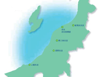 本社は新潟市中央区、営業支店は新発田、燕三条、長岡、上越に構え、新潟県全域のお客様をサポートしています。