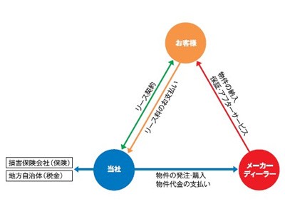 リース案件の関係図です。当社とお客様、車のディーラーや機器のメーカーといった三者間で契約や購入、支払いが発生します。