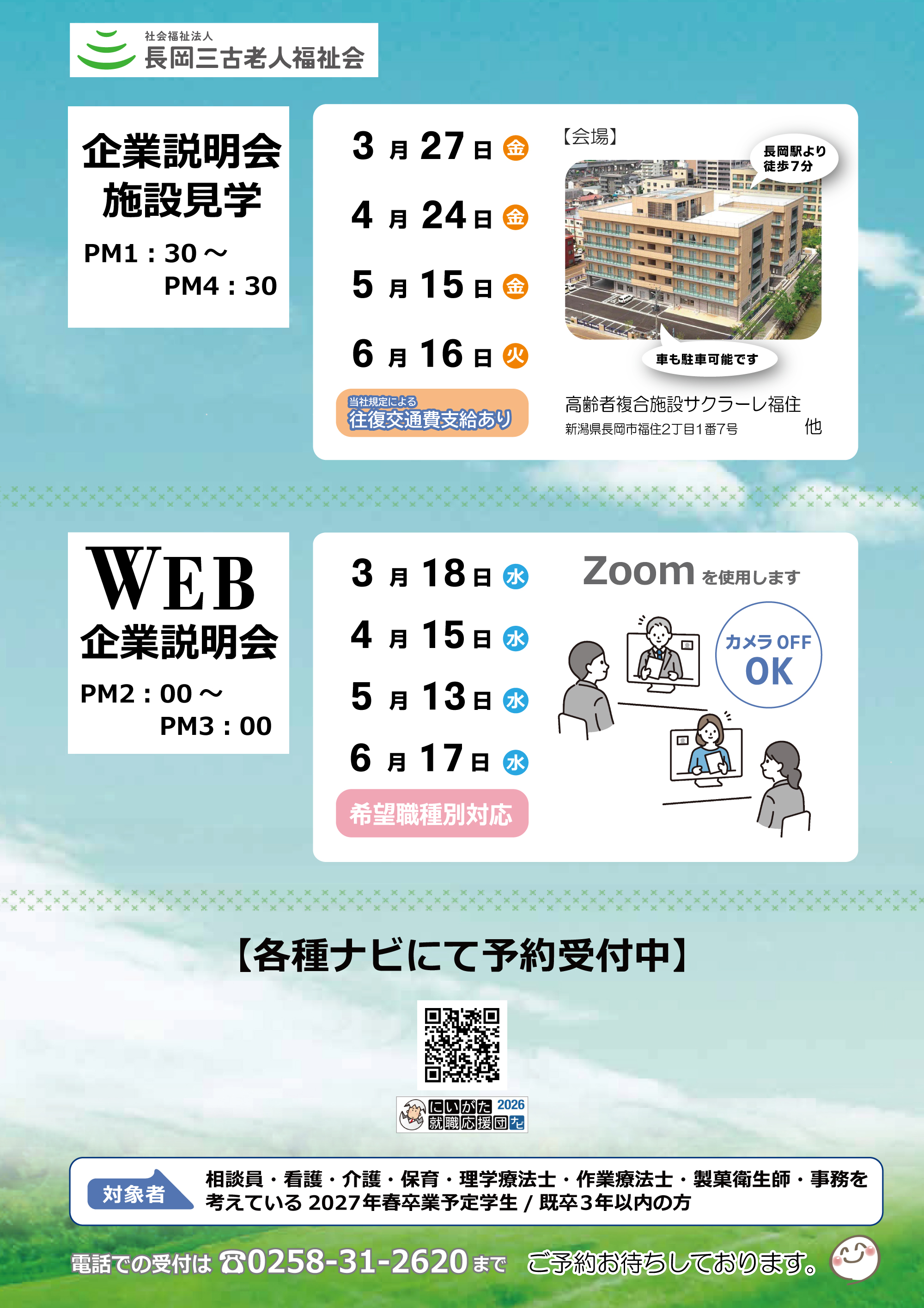 | Zoom接続情報について | 開催日3日前までにZoom接続情報を送らせていただきます。開催日前日にも確認メールを送らせていただきます。メール未達の場合は(0258-31-2620)までお問い合わせください。 |