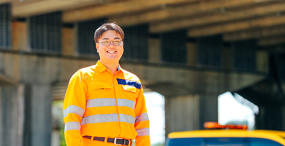 大学は関東でしたが、地元に戻って働きたいと考えUターン就職を希望していました。帰省時によく利用していた高速道路が身近で関心を持つようになり、この会社を志望。安定性や福利厚生の充実に加え、点検・工事・施工管理など幅広い業務に携われる点も魅力でした。さまざまな経験を通じて成長でき、安心して長く働ける環境だと確信し入社を決めました。