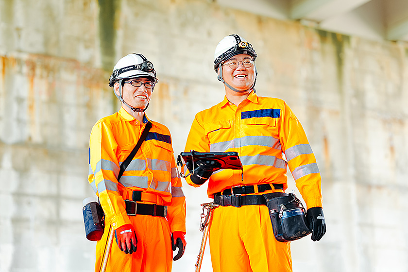 橋梁やトンネルの点検業務を通じて、高速道路の安全を守っています。現場では損傷の有無を確認し、損傷の判定と写真撮影を行います。事務所に戻ってから、データ整理や報告書の作成を行います。後輩指導や点検ルートの選定など、チームで協力しながら安全に作業を進める役割も担います。点検結果は構造物の健全性の診断や補修提案につながり、自分の仕事を通じて直接人々の安全に貢献している点に大きなやりがいを感じています。
