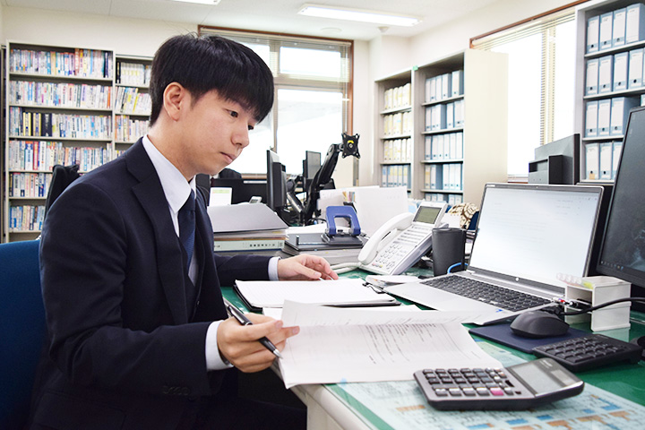 「毎月お客様を訪問し、経営状況などを伺いながら、お預かりした資料をもとに情報をパソコンに入力して税務書類を作成しています。また、1年の締めくくりである決算業務も担当しています。新潟市内を中心に15件ほどのお客様を担当しており、飲食、建設、映像制作、美容室など業種は多岐にわたります。最近では売上数十億円規模の大手企業も担当できるよう勉強中で、税理士の先生や先輩に同行させてもらっています」