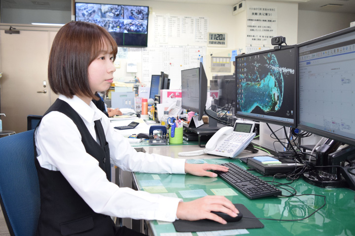 本社内の執務スペース。事務所内には大型モニターが設置され、各事務所と中継が結ばれています。違う事務所で働いていてもモニターを見れば社内に誰がいるか確認できるので、グループ内の連携や作業効率もアップ!
